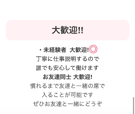 | 募集条件 | 18才〜40才くらいまでの 女の子. *未経験、学生、主婦、 友達同士など大歓迎!! Wワークでも大丈夫です! |